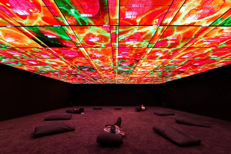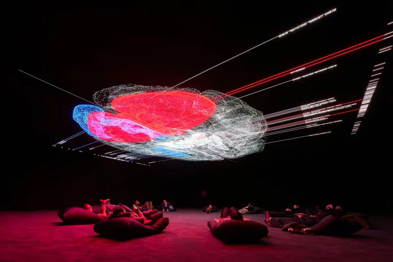 Within minutes we were swallowed by an extraordinary mash‑up of beautiful data connectivity, and chaos! Or as described on the website ‘a total sensory encounter that transforms vast datasets into an immersive audiovisual environment exploring the intersection of art and physics in an unprecedented scale’.